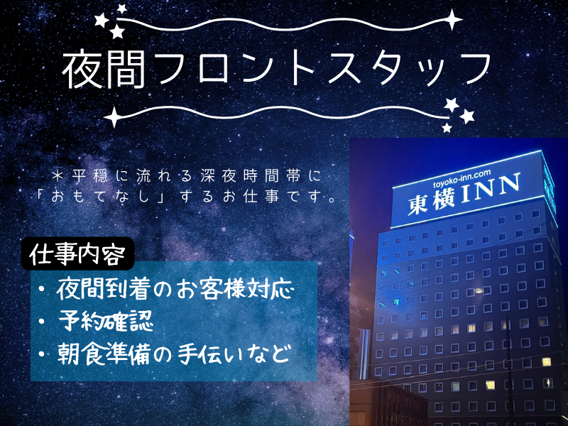 仕事内容 ⭐夜の静かな時間に、落ち着いて働く⭐ 「日中は家のことをしたい」 「昼の仕事とかけもちで働きたい」 そんな方にぴったりの ホテルの夜間フロント募集です。 深夜の時間を活かして、 安定収入を確保しませんか? ✅週2・3日~OK!家庭や昼間の仕事とも両立しやすい ✅複数名体制で安心。未経験でもしっかりサポート ✅静かな夜の時間帯で、落ち着いて働ける <具体的なお仕事内容> ・深夜到着のお客様のチェックイン対応 ・予約内容の確認・入力 ・館内の見回り・簡単な清掃 ・朝食準備のサポート ・チェックアウトに向けた引継ぎ作業 など ✨落ち着いた環境で“自分のペース”で働ける✨  ̄ ̄ ̄ ̄ ̄ ̄ ̄ ̄ ̄ ̄ ̄ ̄ ̄ ̄ ̄ ̄ ̄ ̄ ̄ ̄ 夜間は来客も少なく、穏やかな雰囲気。 決まった流れに沿って進められるので、 慣れれば自分のペースで落ち着いて働けます。 ✨週2・3日~OK!無理なく安定収入✨  ̄ ̄ ̄ ̄ ̄ ̄ ̄ ̄ ̄ ̄ ̄ ̄ ̄ ̄ ̄ ̄ ̄ ̄ ̄ ̄ 家庭と両立したい主婦(夫)さんや、 昼の仕事と掛け持ちしたい フリーターさんも歓迎! 翌日は午前中に帰宅できるので、 日中の時間を有効に使えます。 ✨全国で使える嬉しい福利厚生✨  ̄ ̄ ̄ ̄ ̄ ̄ ̄ ̄ ̄ ̄ ̄ ̄ ̄ ̄ ̄ ̄ ̄ ̄ ̄ ̄ ̄ ̄ 全国の東横INNでの宿泊が30%OFF! ご家族・ご友人も20%OFFで利用OK。 映画・グルメ・レジャーなどが会員価格で使える 「ベネフィット・ステーション」もあり、 働く楽しみが広がります。 応募方法  ̄ ̄V ̄ ̄ ̄ ̄ ̄ ̄ ̄ ✨直接採用担当とお話ししたい方 →電話での応募大歓迎! 0742-85-1045 までお気軽にお問い合わせください! ✨【応募】ボタンから応募の方 →エントリー後、担当者からご連絡差し上げます。 ご連絡が取れる 電話番号またはメールアドレスの 記載をお願いします。