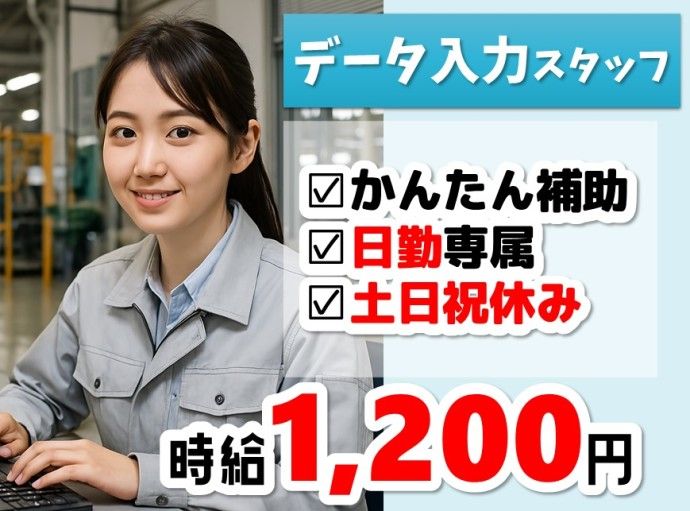 仕事内容 【✨かんたんデータ入力スタッフ募集✨】 レンズなどを手掛ける工場のでパソコン作業をお任せします! フルタイムOK・時短勤務もOKです! ━━━━━━━━━━━━━━ ◆ お仕事内容 ◆ ━━━━━━━━━━━━━━ ☆生産課でのデータ入力スタッフ ・Excel、Wordを使用したかんたんな資料作成 ・専用のシステムへの入力作業 ・その他、生産課での業務補助 ☆あくまで「補助」業務なので、かんたんな作業がほとんど! ☆Excel・WordがつかえればOK! ☆座り作業メイン ━━━━━━━━━━━━━━ ◆ ここがポイント ◆ ━━━━━━━━━━━━━━ ✔ PC作業が好きな方におすすめ ✔ 他部署とのやり取りもあるので、人と関わりたい方にもおすすめ ✔ キレイ・冷暖房完備なので快適にお仕事できます ✔プライベートも両立しやすい日勤・土日祝休み 9:00~16:00等の時短も出来るので生活スタイルに合わせられます ✔うれしい高時給1,200円♪ ✔20代~40代の男女スタッフ活躍中☆ ━━━━━━━━━━━━━━ ◆ NCIのおすすめポイント ◆ ━━━━━━━━━━━━━━ ・困った時は担当営業がしっかりフォロー ・お仕事の悩みも気軽に相談OK ・誕生日にはちょっとうれしいプレゼントあり♪ ・「次のお仕事を探したい」という時も安心サポート