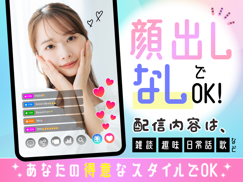 仕事内容 <<顔出しナシOK(>v<)b⌒✨>> スマホ1台で自分らしく輝く☆彡 ライブ配信スタッフ(ライバー)大募集! 「新しいことを始めてみたいけれど、 顔を出すのは少し不安…」 「家事や仕事の合間に、 自分だけの『居場所』を作りたい」 ▼ ▼ ▼ そんな20代・30代の女性が、 今続々とデビューしています! \\特別なスキルは必要ありません// スマホ1台あれば、 ご自宅があなたのステージに早変わり! ラジオ配信も選べるので、 リラックスしたスタイルで 自分らしくお話ししてみませんか? ☆━━━…‥・☆━━━…‥・☆ ⏩お仕事内容 ライブ配信アプリを通じて、 視聴者の方と楽しくお話ししながら 場を盛り上げるお仕事です。 「話すだけ」であなたのファンができる、 温かくてワクワクする世界が待っています。 ╭━━━━━━━━━━━╮ ⭐どんなことを話せばいい? ╰━v━━━━━━━━━╯ 雑談、料理、弾き語り、占い、 ゲーム、歌、日常の何気ない話など、 あなたの得意なスタイルでOK! ╭━━━━━━━━━━━╮ ⭐具体的にやることって…? ╰━v━━━━━━━━━╯ ・アプリでのライブ配信 ・視聴者さんからのコメントへの 返信・コミュニケーション ☆━━━…‥・☆━━━…‥・☆ ⏩未経験でも安心の「伴走型」サポート 「何を話せばいい?」 「続けられるかな…」 そんな不安も、 私たちと一緒に解消していきましょう! 元トップライバーの専属マネージャーが、 あなたの「伴走者」として マンツーマンでサポートします。 ◤∥ 徹底サポート内容 ∥◢ □初期設定や配信手順を イチから丁寧にご案内 □話題に困らない トーク例や企画案をシェア □チャットやビデオ通話で、 お困りごとも即座に解決 □無理のない配信ペースを、 生活リズムに合わせてご提案 ✅自分にぴったりの場所を選べます!  ̄ ̄ ̄ ̄ ̄ ̄ ̄ ̄ ̄ ̄ ̄ ̄ ̄ ̄ ̄ ̄ ̄ あなたに最適なプラットフォームを、 一緒に選んでいきましょう♪ TikTokLIVE/Pococha/Palmu ✅働き方は「超・自由」!  ̄ ̄ ̄ ̄ ̄ ̄ ̄ ̄ ̄ ̄ ̄ ̄ ̄ ̄ ̄ ̄ ̄ ★全国どこからでも参加OK! ★家事、育児、本業、学業との両立も◎ ★スキマ時間からスタートできます♪ ★最短2日で配信デビューも可能です! ☆━━━…‥・☆━━━…‥・☆