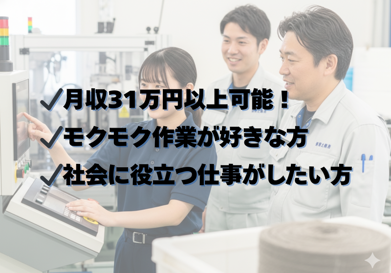 仕事内容: ≫——————————————————≪ 地球にやさしいナイロンリサイクル! モクモク×アクティブで飽きずに働ける! 未経験OK&月収31万円以上可能の高時給ワーク! ≫——————————————————≪ 【当社の魅力】 ✅ 時給1,550円〜!安定してしっかり稼げる ✅ シンプルな機械操作で安心スタート! ✅ 外国人・50代も活躍中!幅広い年代が在籍 ✅ ペットボトル由来の原料を再利用!環境に貢献できる仕事 「モクモク作業だけだと飽きる…」 「体も少し動かしながら働きたい」 そんな方にピッタリの職場です。 【仕事内容】 ペットボトルなどのプラスチック原料を 機械でナイロン樹脂に加工するお仕事です。 操作はとてもシンプル。 難しい作業はなく、未経験の方でもすぐに慣れていただけます。 【業務の流れ】 ・ペットボトル由来の原料を機械にセット ・ボタンをポチっと押して機械を操作 ・機械の稼働状況をチェック ・リサイクル原料を機械へ投入 ・出来上がった製品の検査・梱包 ・ハンドリフトを使った製品の運搬 ※製品はナイロン製のため、重量物はありません。 【未経験でも安心の理由】 ・作業内容はシンプルで覚えやすい ・先輩スタッフが丁寧にサポート ・重たい作業なしで身体への負担も少なめ 工場勤務が初めての方、 事務・アルバイト・パート経験しかない方も多数活躍中です。 まずは、お気軽にお問い合わせください♪