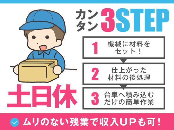 仕事内容 西白河郡泉崎村の自動車部品製造工場でのお仕事です。 【仕事内容】 自動車部品のカンタン加工補助のお仕事をお願いします。 機械に材料をセット ↓ 仕上がった材料の後処理 加工した製品を取り出し台車に積むだけ。 流れはとてもカンタンです。 すぐにお仕事を覚えることができます。 業績好調により増員募集。 程よく残業も職場なので収入UPが見込めます。 さらに土日休みなのでプライベートと仕事の両立間違いなし! お早めにご応募下さい。 お待ちしております。