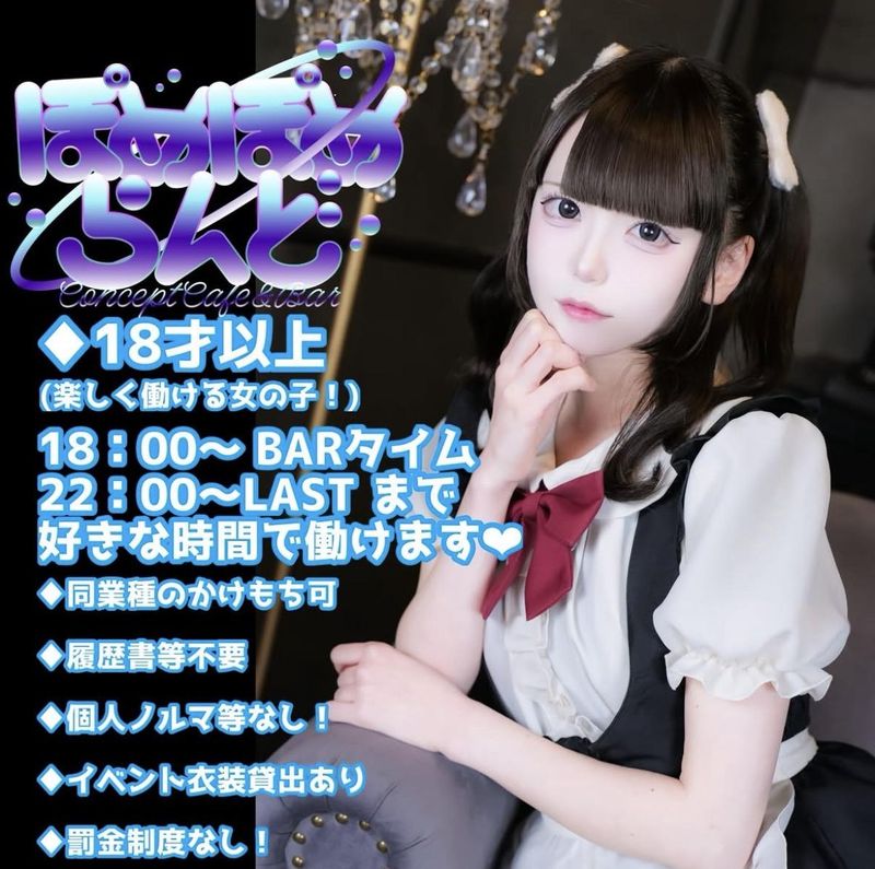 求めている人材 ⭐️学生さんでも大丈夫! ⭐️フリーターさん大歓迎! ⭐かわいい制服から選んで無料レンタル ⭐️メイド喫茶などで働いたことがある方歓迎! ⭐️コンセプトカフェ(コンカフェ)や バーで働いたことがある方歓迎! ⭐️10代~20代後半まで活躍 ⭐️アニメ・ゲーム・漫画など サブカルチャー好きが活躍 (オタクの方、大大大歓迎!) アピールポイント 系列店でカラオケ大会や レクリエーション盛沢山! 性別の条件と理由:女性限定(風紀上)