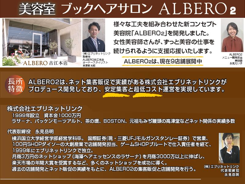 アピールポイント: ✼┈┈┈┈┈┈┈┈┈┈┈┈┈┈┈┈┈┈┈✼ 【 全10店舗展開!今後も続々出店予定 】 現在、広島エリアに10店舗を展開中✨ (古江本店/庚午店/楽々園店/十日市店 比治山店/大野原店/熊野店/横川店 戸坂店/牛田店) 今後も新店舗の出店を計画しています! ✼┈┈┈┈┈┈┈┈┈┈┈┈┈┈┈┈┈┈┈✼ WEB系の(株)エブリネットリンクがアルベロ古江本店を 母体に開発したアルベロ2は、 得意のネット事業による安定集客と超低コストを実現。 自分で自分のシフトと予約を組めるようにした 働く人ファーストの新コンセプト美容院です。 本部の(株)エブリネットリンクは、本業がネット事業。 海藻ヘアエッセンスのラサーナのネットショップを 月商3万円から3000万円以上に伸ばし 楽天市場の年間大賞を受賞する他、 バッケンモーツアルト・茶の環・洋菓子のBOSTON・ 元祖もみぢ饅頭の高津堂など実績多数。 2015年に自社のノウハウをリアル事業に活用すべく、 アルベロ本店を母体に新コンセプト美容院 アルベロ2を新規開発。 ✼┈┈┈┈┈┈┈┈┈┈┈┈┈┈┈┈┈┈┈✼