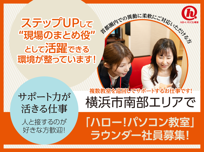 仕事内容 ╭────────────・⭐・・─╮ 寄り添う力が、いちばんのスキル。 ⼈と関わるのが好きなあなたに、 ぴったりのステージがあります︕ ╰─・・⭐・────────────╯ パソコン教室のラウンダーとして、 横浜市南部エリアを中心とした近隣の 教室を巡回し、運営サポートや 生徒さんの対応を行います。 ✅具体的には… ・PC操作のレッスン ・学習プラン、カリキュラム作成 ・生徒さんの進捗管理 ・入会案内、教室説明 ・販売促進(チラシ配布、SNS投稿) ・教室管理、事務作業 ・試験官など レッスンから教室運営まで幅広く お願いしていきますが、独自の 研修プログラムでしっかり学べます! \⛵スキルに自信がない方もOK⛵/ マイクロソフトオフィススペシャリスト など、資格取得に向けた研修制度も整っています。 カリキュラムの内容もPC操作以外に、 AI講座や、動画編集・画像加工など 時代のニーズに合わせた内容をご用意。 「生徒さんと一緒に成長していける」 そんな環境がここにはあります。 ╭────────────・⭐・・─╮ 首都圏内転勤があるお仕事です! ╰─・・⭐・────────────╯ チーム運営や業務推進に応じて、首都圏内での転勤が発生する可能性があります。 もちろん入社後すぐに「いきなり転勤」 ということは基本的にありません。 まずは現在の勤務地で経験を積み、 業務に慣れていただくことからスタート。 その後、状況やキャリアプランに応じて、 転勤の相談させていただく可能性があります。 結婚・出産・子育て・介護など、 ライフスタイルを十分に考慮したうえで判断いたしますので、ご安心ください。 ※転勤の場合、家賃補助や引っ越し費用の 手当てがあります✋ ✅初任地は下記教室での勤務です ☕イトーヨーカドー大船校 神奈川県鎌倉市大船6丁目1-1 JR東海道線大船駅徒歩5分 ☕イオン茅ヶ崎中央校 神奈川県茅ヶ崎市茅ヶ崎3丁目5-16 JR東海道線茅ヶ崎駅徒歩10分 ☕イトーヨーカドー洋光台校 神奈川県横浜市磯子区洋光台3丁目10-3 JR根岸線洋光台駅徒歩10分 ☕イトーヨーカドー能見台校 神奈川県横浜市金沢区能見台東3-1 京浜急行線能見台駅徒歩10分 ☕イトーヨーカドー桂台校 神奈川県横浜市栄区桂台中15-1 JR根岸線港南台駅からバス約15分 【チームで教室をつくる仕事です】 この仕事は、一人で完結するものではありません。 生徒様対応、入会案内、運営改善。 すべてをチームで共有しながら進めています。 困った時はすぐ相談。 良い事例はすぐ共有。 教室全体でより良い形をつくる文化です。 「自分のやり方」だけに拘るのではなく、 みんなでより良い教室をつくっていきたい。 そんな想いをお持ちの方をお待ちしています。