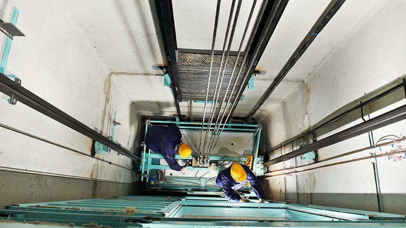 荷物用エレベーターの工事スタッフ