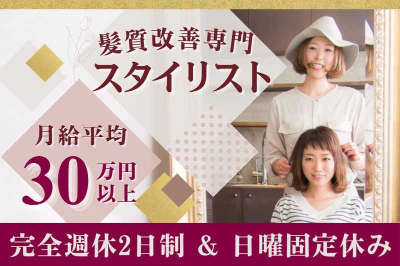 【アピールポイント】 \働きやすさ抜群の美容室/ 髪質改善専門サロンでスタイリストスタッフを正社員募集 ★平均月収30万円以上/土日祝休み可/残業少なめ ★奨学金代理返還制度でサポート ★ファッション誌で話題 ※美容師免許をお持ちの方※