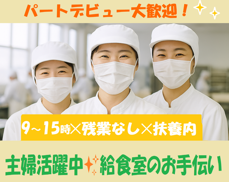 職場環境 人間関係のしがらみゼロ。 2026年4月に当社運営となり新規オープンの給食室で一緒にスタートしませんか。 主婦・子育てママなど20代、30代、40代、50代の女性がたくさん活躍中。家庭と両立しながら働ける、人気の給食室パート! ⭐美味しい給食ランチ付!