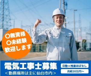 仕事内容 電気工事士(正社員)募集! 20代~40代活躍中! 働きながら電気工事士の資格が取れます! 無資格の方や異業種からの転職者も歓迎!! <正社員:電気工事士のお仕事> 主に一般住宅の屋内配線・空調設備・ アンテナ設置・エアコンの取付などの 各種電気設備工事をお願いします。 現場は主に仙台市内です。 ※弊社事務所から社用車で現場へ出向き、 作業開始となります。 出張ほとんどありません。 (前年度は1泊程度のみ) 始めは簡単な作業からスタート! 慣れてきたらスキルに応じた作業を 担当していただきますのご安心ください! <資格取得支援制度あり> 資格がなくてもご応募歓迎! 働きながら資格取得もできます! 入社後、資格取得した先輩社員も在籍! <働き方ご相談ください> 個人により働き方も変えられますので、 ご連絡をお待ちしております♪ WワークOK! 一人で黙々と作業をすることが好きな方、 みんなで一緒に働きたい方、どちらでも構いません! 私たちと一緒に電気工事を深めませんか。 経験者は優遇させていただいておりますが、 興味をお持ちの未経験者も随時募集しています★ ※直行直帰OK 業務委託として月・水・金などの週3日~自由な働き方もOK! 正社員または業務委託としての働き方も選べます! <長期安定の正社員雇用> 大手住宅メーカーや 不動産会社からの依頼がメインなので 年間を通して安定した仕事があります。 <プライベート時間も大切にできる> 有給休暇は取得率100%! 残業はほぼありません。 GW・夏季・年末年始休暇もあり、 お休みもしっかり取れます。 仕事もプライベートも充実できる会社です! <職場環境> 現在5名のスタッフが在籍しています。 少人数の職場なので、 代表が一人一人の社員をしっかり サポートできる環境が整っています。 資格・経験は問いません。 電気工事の仕事に興味がある方 ご応募お待ちしております!