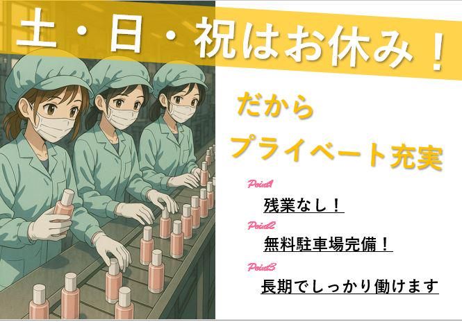 仕事内容 ~メリット多数あり~ ◎土日祝休み ◎残業なし ◎重いものなし ◎無料駐車場 ◎制服支給 ◎プライベート充実 シャンプーボトルの検品。 キャップ締め。 シールを貼るなどの軽作業。 簡単なライン作業です。 未経験者もすぐに出来ます。 20代、30代、40代 男女スタッフ活躍中。 『工場未経験だけど・・・』 『私にできるかしら・・・』 などお考えの方、まずはご相談ください。 工場未経験スタッフもすぐに覚えられます。