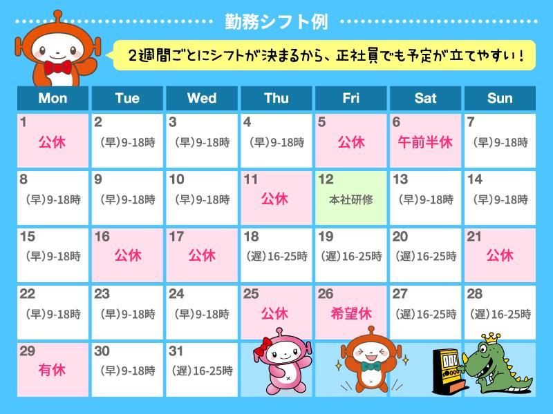 休日休暇 ◆交代制(4週8休制) ※月8~9日程度 ※曜日はシフトによる ◆年間休日116日以上 <その他・休暇> ◆有給休暇(入社半年後10日付与) ◆夏季休暇3日 ◆冬季休暇4日 ◆慶弔休暇 ◆特別休暇 ◆介護休暇 ◆出産休暇 ◆育児休暇 など ※連休取得も可能なのでプライベートも充実!