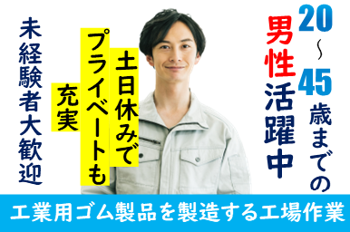 仕事内容 オープニングスタッフ大募集!土日休み!工場勤務が未経験の方も大歓迎!嬉しい週払い制度もあります◎ <仕事内容> ◇工業用ゴム製品を製造する工場で、材料から製品にする工程をお任せします。 業務内容はとてもシンプル! 材料を準備→金型にセット→出てきた製品の取り出し この作業の繰り返しになります。 製造未経験の方でも安心してお仕事ができる業務です。 立ち作業でのお仕事です。 個人作業・グループ作業どちらもございます。 《環境》 男性が多い職場です。 冷暖房完備です。 ロッカー有り|休憩室完備 アピールポイント <仕事内容> ◇工業用ゴム製品を製造する工場で、材料から製品にする工程をお任せします。 業務内容はとてもシンプル! 材料を準備→金型にセット→出てきた製品の取り出し この作業の繰り返しになります。 製造未経験の方でも安心してお仕事ができる業務です。 立ち作業でのお仕事です。 個人作業・グループ作業どちらもございます。 《環境》 男性が多い職場です。 冷暖房完備です。 ロッカー有り|休憩室完備 \充実した福利厚生/ ◎社会保険・雇用保険完備 ◎有給休暇有(6ヶ月経過後、10日付与)※規定あり ◎残業手当 ◎交通費支給(規定内) ◎確定拠出年金制度 ◎週払い制度(週3回対応) ◎お友達推薦制度あり(規定有り) ※1名につき3万円~10万円臨時給与として支給 ◎職場見学あり ◎車(マイカー)通勤可(無料駐車場あり) ◎制服貸与 ◎冷暖房完備 ◎食事持参可 ◎仕出し弁当注文可(1食350円) ◎食事スペースあり ◎ロッカー・休憩室利用可 ◎福利厚生プログラム (宿泊、グルメ、ショッピングなど大幅割引が受けられる10万アイテムのメニューがあります。)
