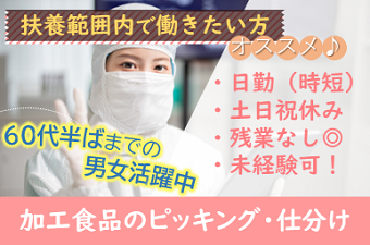 仕事内容 扶養範囲内で働きたい方必見!!Wワークにもおすすめ♪短時間勤務だからプライベート充実☆パッキングされた製品を仕分けるカンタン作業!! <仕事内容> パッキング済みの調理用ホルモンや、ハンバーグ、生肉を配送先別にピッキング、仕分けるお仕事になります。 伝票に種類と個数、配送先が書かれているので、その指示通りに製品をコンテナに並べていきます。 その後、指定の個数が用意できましたら、台車で指定の場所まで動かします。 最初は教えてもらいながら2人1組で行い、慣れてきたら1人で行います。 重量物はないですし、時短勤務なので老若男女活躍中です! クリーンルーム内でのお仕事です。 個人作業となります。 《職場環境》 外国籍の方が活躍中です。 シニア活躍中です。 冷暖房完備です。 ●作業場は冷蔵庫の中になるので5~10℃の温度に保たれています。 ロッカー有り|休憩室完備 アピールポイント <仕事内容> パッキング済みの調理用ホルモンや、ハンバーグ、生肉を配送先別にピッキング、仕分けるお仕事になります。 伝票に種類と個数、配送先が書かれているので、その指示通りに製品をコンテナに並べていきます。 その後、指定の個数が用意できましたら、台車で指定の場所まで動かします。 最初は教えてもらいながら2人1組で行い、慣れてきたら1人で行います。 重量物はないですし、時短勤務なので老若男女活躍中です! クリーンルーム内でのお仕事です。 個人作業となります。 《職場環境》 外国籍の方が活躍中です。 シニア活躍中です。 冷暖房完備です。 ●作業場は冷蔵庫の中になるので5~10℃の温度に保たれています。 ロッカー有り|休憩室完備 \充実した福利厚生/ ◎社会保険・雇用保険完備 ◎有給休暇有(6ヶ月経過後、10日付与)※規定あり ◎残業手当 ◎交通費支給(規定内) ◎確定拠出年金制度 ◎週払い制度(週3回対応) ◎お友達推薦制度あり(規定有り) ※1名につき3万円~10万円臨時給与として支給 ◎車(マイカー)通勤可(無料駐車場あり) ◎作業服貸与 ◎冷暖房完備 ◎食事持参可 ◎ロッカー・休憩室利用可 ◎福利厚生プログラム (宿泊、グルメ、ショッピングなど大幅割引が受けられる10万アイテムのメニューがあります。)