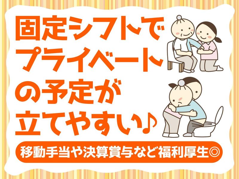 待遇・福利厚生 【福利厚生】 介護福祉士手当 車・バイク・自転車通勤OK 交通費規定支給 自動車保険補助 100円/日 移動手当 300円(利用者間の移動が1時間以内の場合) 決算賞与あり(およそ給与1か月分※年度末/実績による)