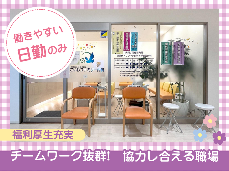 仕事内容 ⭐【時給2700円】勤務は土日限定⭐ ブランクからの復帰も安心な優しい職場 他のクリニック・病院との掛け持ちもOK =================== ✅経験を評価★時給2700円の好条件 ✅土曜のみor日曜のみもOK ✅土日両方勤務可能な方も可 ✅内科以外での経験も歓迎 ✅通勤・ランチ・仕事の後も便利な 小岩駅南口スグの好立地! ✅同居家族もOK! グループ医療機関での診療費補助有 【お仕事内容】 内科クリニックでの看護師業務全般。 ■診察補助 ■処置・健康診断 ■発熱外来対応 ■採血・ワクチン接種等の注射 ■クリニック内の環境整備など ================== ⭐地域に親しまれ、患者様も増加中 2021年4月、小岩駅南口すぐの 「FIRSTA 1」ビル5Fにオープンした 内科クリニックです。 院長はリウマチ・膠原病内科の専門医で、 総合内科の診療も行い、地域の方々の 幅広いニーズに応えています。 急な体調不良や発熱外来のほか、 健康診断や各種予防接種、 美容注射などにも対応しており、 院長の専門性を活かした診療を 提供しています。 地域に密着したクリニックとして、 スタッフ間のチームワークや コミュニケーションも重視しており、 院長とスタッフが一丸となって 温かくサポートする環境が整っているため、 安心して長く働ける職場です。 ⭐様々な方が働きやすい環境 当院をはじめ、幸訪会グループでは 様々なライフステージの職員の方の 勤務実績があります。 たとえば… *子育てがひと段落して、 職場への復帰をお考えの方 *ご家族の介護が落ち着いて、 久しぶりのお仕事の方 *Wワークであと少しだけ 収入を増やしたい方 *パートから始めて正職員を目指したい方 そのような方も、現場での仕事が 無理のないよう配慮していますので、 とても働きやすい環境ですよ。