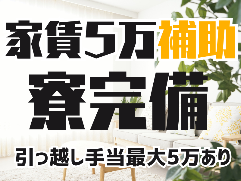 アピールポイント: ーーーーーーーーーーーーーーーーー 家賃は5万迄会社負担の社宅完備! 引っ越し費用も5万補助あり◎ 履歴書ナシで応募OK! しかも面接はサクッとWEB完結! ーーーーーーーーーーーーーーーーー * 綺麗な社宅に格安で住める * 引っ越し費用最大5万補助 * 空調完備の快適職場 * 20~45代活躍中 * 長期就業スタッフ多数 * 全国から仲間がたくさん! ===前払い制度あり=== 日払いも、週払いもOKです! 今月ピンチ…そんな時に超便利! スマホのアプリでサクッと申請! \お気軽にご相談ください!/