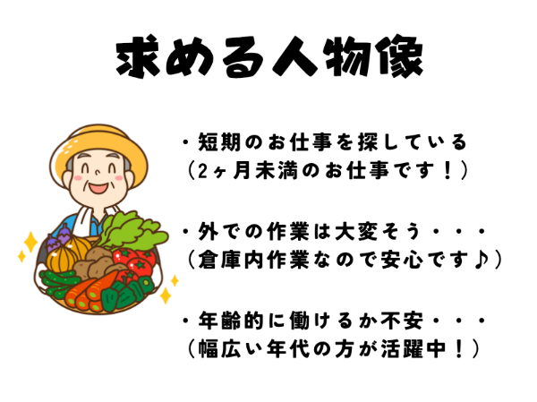 短期!勤務開始~2ヵ月未満のお仕事!トマトとブロッコリーの収穫 トマトとブロッコリーの収穫 北海道夕張郡長沼町旭町南3丁目7-1 派遣社員 求人の特徴 オンコールなし シフト自由 原則定時退社 固定シフト制 土日祝休み 夜勤なし 完全週休二日制 実働 7.5 時間 平日のみ OK 年間休日 120 日以上 残業なし 残業ほぼなし 深夜勤務なし 週 2・3 日から OK 週 3・4 日から OK 週 4 日以上 OK 週休 3 日 中卒・中認合格 大卒 専門卒 短大卒 高卒・高認合格 高専卒 交通費支給 連続休暇取得可能 U・I ターン歓迎 バイトデビュー歓迎 ブランク OK フリーター歓迎 中卒歓迎 主婦・主夫歓迎 学歴不問 新卒歓迎 未経験者歓迎 業界未経験者歓迎 第二新卒歓迎 経験浅め歓迎 高卒歓迎 リモート面接 OK 勤務開始時期調整 即日勤務 OK 職場見学可 電話で応募・問い合わせ 面接 1 回 転職回数不問 オフィスカジュアル OK カジュアル OK クールビズ OK ジーンズ OK スニーカー OK ノーネクタイ OK ピアス OK ひげ OK 服装自由 髪型・髪色自由 車通勤 OK 残業手当あり 週払い OK 業務内容 未経験の方大歓迎! 「楽しく働ける」と大好評のお仕事ですよ♪ 20代~70代の方も大活躍中♪ ━━おすすめポイント━━ ◎年齢不問 ◎週3日~OK ◎コツコツモクモク作業 ◎学歴・経験不問 ◎事前に職場見学ができるので安心♪ 【仕事内容】 収穫されたトマトとブロッコリーを仕分けするお仕事です。 ※勤務開始~2ヵ月未満の短期のお仕事です(毎年来て下さる方も大歓迎です!)。 【お仕事の流れ】 ・コンテナボックスを確認する ・大きさで仕分けする ・品質の悪い物を仕分けする などのお仕事をお願いいたします。 ※8:30~17:30勤務の募集です。 ※倉庫内でのお仕事なので、天候の影響もなくて安心です。 未経験から始めている方が多数! すぐに覚えられるお仕事なので安心です♪ ※当社が雇用する派遣スタッフとして派遣先で勤務いただきます 職種 トマトとブロッコリーの収穫 雇用形態 派遣社員 勤務体系 固定時間制 リモートワーク制度 リモートワークなし 勤務先事業内容 労働者派遣事業・有料職業紹介事業・登録支援機関