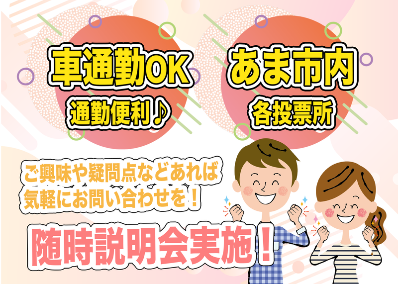 仕事内容 衆議院選挙当日2/8(日)1日のみ! あま市内の投票所内で受付や案内業務をお願いします。 ・受付(投票に来た方の本人確認) ・投票用紙の配布 ・会場内の案内 ・簡単な清掃(投票に使用する鉛筆の拭き取りなど) など投票所内での受付事務になります。 丁寧な対応ができる方ならOK! ※あま市内の24か所の投票所のいずれかでの勤務となります。 ※期日前投票所はあま市役所になります。