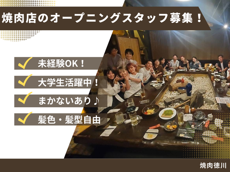 仕事内容 完全紹介制の隠れ家的焼肉店でオープニングスタッフ募集!! ✨アピールポイント✨ ┃12月中旬新規オープン! ┃週3日~OK ┃シフト融通◎ ┃髪型・髪色・ピアス・ネイル自由! 【具体的なお仕事内容】 ・お席へのご案内 ・注文取りやドリンク出し ・料理の提供・片付け など 元気な接客ができる方大歓迎♪ ★★★★働くメリット多数ご用意★★★★ 学校もバイトも遊びも全部楽しめる環境✨ ◆シフトは2週間毎の提出! ◇テスト期間や就活も考慮◎ ◆一緒に働く仲間の人柄が最高! ◇お腹いっぱい食べられる絶品まかない有り 【注目POINT】 ★★★★当店独自!自慢の支援制度★★★★ ▼夢応援システム 資格や試験の費用を一部会社が負担 バイトしながらがら夢を叶えちゃおう!! ▼リフレッシュ飲食代支給 2ヶ月に一回、日頃の疲れを取るため 飲食代5000円まで会社負担(社内規程あり) ▼従業員食べ飲み放題 小腹が空いた用のお菓子お茶食べ飲み放題 うちで働いたらお菓子買わなくてすむよ♪ ▼お友達紹介制度 バイトを紹介して嬉しい紹介金ゲット♪ ▼よく頑張ったで賞 毎月お店のMVPを選出! 温泉チケット等 豪華景品がもらえちゃう♪ ▼イベント多数実施 系列店合同で楽しいイベント多数ご用意! 夏 :バーベキュー 冬 :スノーボード その他:親睦飲み会、急にラーメン会、 急にお寿司会、急に中華会、など 飲み会もありますよ~(笑) ★★★働き方改革実施中★★★★ 髪色・髪型・ピアス・髭・ネイル等自由⭐ オシャレしながら働けます! バイト未経験者も大歓迎♪ 未経験から始めたスタッフも 多数在籍しております! 【お店について】 ♪♪:*:・・:*:・♪・:*:・・:*:・♪:*:・・:*:・♪♪ 焼肉徳川は2025年12月中旬に新規オープンする 紹介制の焼肉店です。 厳選された黒毛和牛や新鮮な野菜を用いて 焼肉だけでなくサイドメニューやデザートまで、 すべての料理でお客様に感動と笑顔をお届けします✨ 今回はオープニングスタッフとして 一緒にお店を盛り上げてくれる 仲間を大募集します! ♪♪:*:・・:*:・♪・:*:・・:*:・♪:*:・・:*:・♪♪