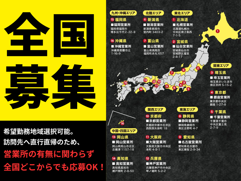 勤務地 自宅近郊での活動を前提としています。 ご希望の勤務エリアをご相談ください。 訪問先へ直行直帰のため、営業所の有無に関わらず全国どこからでも応募OK! ※駐車場代、車両経費は全額会社負担 ※転勤なし