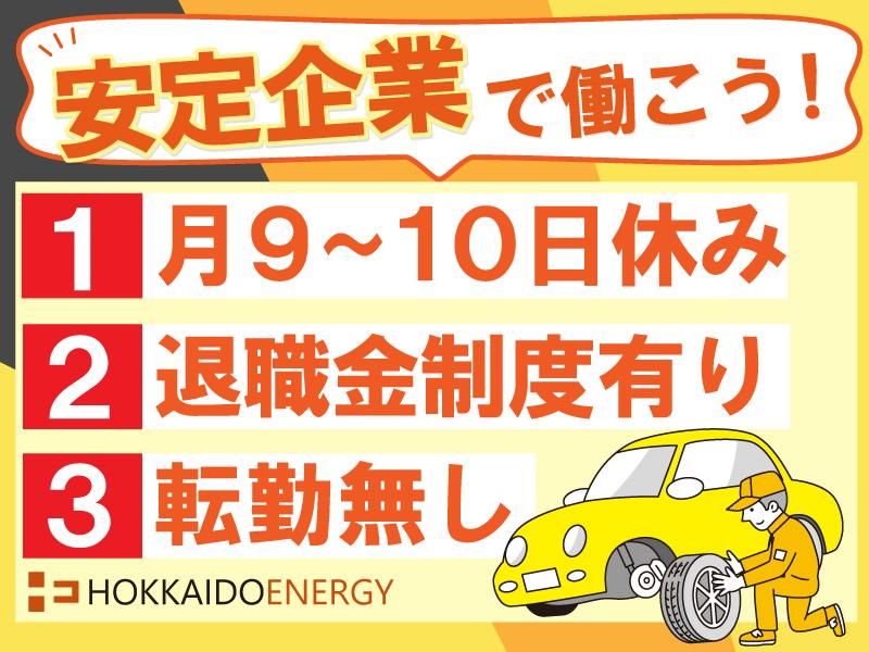 仕事内容 \整備に専念できる「分業制」工場/ 日祝固定休+残業月10時間程度。 営業・受付対応なし。転勤もありません。 整備士資格・経験が無い方も応募可能です! 安定企業の正社員募集×国家資格取得応援! ー ENEOSを道内250店舗以上展開する 北海道エネルギーの車検センター勤務です。 年間2万台の実績を誇る、 運輸局指定の安定整備工場です。 完全未経験から整備士資格取得を目指しながら、 正社員として働くこともできます。 <北海道エネルギーのオススメポイント!> *日曜・祝日固定休 *年間休日110日 *残業月平均10時間 *分業制で営業対応なし *転勤なし *国家資格(整備資格)取得を会社が支援 *賞与年2回+各種手当充実 「整備に集中できる環境」を整えています。 【具体的な業務は】 軽・小型、普通自動車、小型貨物車など、 自動車の車検・整備業務を行います。 まずは先輩整備士の補助業務から始めて、 仕事の流れを少しずつ覚えていただきます。 無資格の方でもできる範囲の作業をお任せするため、 先輩の指示通りに進めていただければ大丈夫です。 完全未経験の方が「3級」自動車整備士資格を取得するには、 半年以上の実務経験が必要となるため、 入社後半年間は整備補助業務を覚える期間となります。 また、当車検センターは「分業制」のため、 整備スタッフが営業・受付業務を対応することは無し。 整備業務に専念できる環境です。 もちろん営業職への異動などもございません! <有資格者・経験者の方には> 経験を活かし、整備士として入社後よりご活躍いただきます。 資格手当も支給いたしますので、即戦力としての活躍を期待しています。 *無資格入社の方も資格取得後より手当支給有 <スピーディーな選考をお約束いたします> 入社日のご相談も応じますので現職の都合がある方や、 今すぐ働きたい方も大歓迎です。 また、学歴や転職回数は一切関係無し。 職歴に自信が無い方や短期離職の経験がある方も、 まずはお気軽にご応募ください。