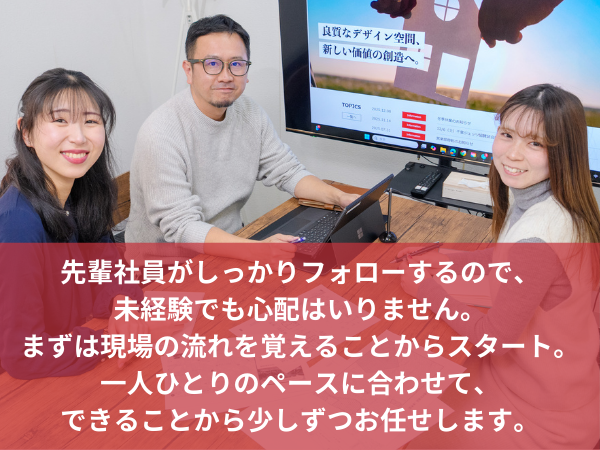 仕事内容 \現場を支える調整役として、一生モノのスキルを身につけませんか?/ ◇仕事内容◇ まずは施工管理の補助業務からお任せします。 具体的には *現場の巡回(電車移動が中心) *職人さんとの打ち合わせ・作業確認 *工事の進捗チェック *電話対応(職人・社内連携) *事務所での簡単な事務処理(Excel・管理アプリ) 最初は先輩と一緒に行動します! いきなり一人で現場を任せることはありませんのでご安心ください。 ◇入社後のステップ 入社~半年 ・現場の流れを理解 ・先輩のサポートをしながら1現場を担当できる状態へ 1年後 ・2~3現場を同時に管理 ・職人さんとも信頼関係ができる状態へ 将来 ・現場の中心メンバーとして活躍 ・マネジメント思考の方は、将来的にマネージャーも目指せます (※無理に管理職をお願いすることはありません) \現在働いているスタッフにお伺いしました!/ ◇この仕事のやりがいはなんですか? Fさん:何もないところから自分の段取りで建物が完成する達成感にやりがいを感じています。 Kさん:多くの人と関わりながら、現場をまとめる面白さにやりがいを感じます。 Sさん:お客様に直接「ありがとう」をもらえる仕事です! ◇大変なところはなんですか?(正直に書きます) Fさん:外での仕事が中心なところです(汚れることもあります) Kさん:電話対応が意外と多いところです。 Sさん:職人さん・社内など、コミュニケーションが多めなとろが大変だと感じることがあります。 その分、人と話すことが苦じゃない人には向いています! 評価制度が整っているため、次に何を目指すべきかが明確です。 頑張りが正当に評価される環境で、 成長を実感しながら新しい挑戦をしたい方をお待ちしています。