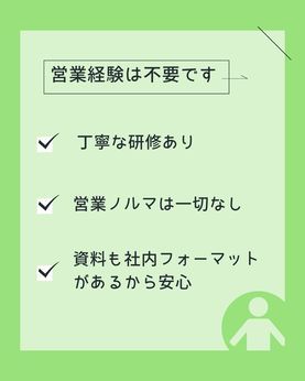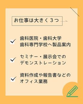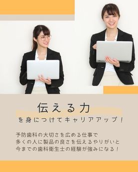 資格 【必須】 歯科衛生士資格 【歓迎】 歯科関連メーカーやディーラー等での訪院活動経験者 【スキル】 PowerPointを使ったプレゼンテーション経験 ZOOMやTeamsなどを使ったオンライン業務経験 基本的なPCスキル(Word・Excel・PowerPointで初級レベル以上) 前向きにチャレンジできる方、意欲を持って仕事に取り組める方