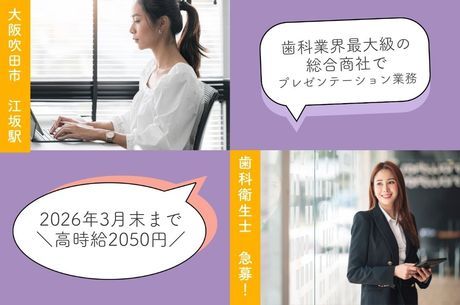仕事内容 【お仕事の内容】 ・歯科医院向けに、予防製品やモリタ製品の情報提供・営業活動(ノルマなし) ・プロパー営業への同行や オンラインセミナーでの製品紹介 ・歯科衛生士学校・歯科医院での予防製品セミナーの実施 ・デンタルショーや各種イベントでのデモンストレーション ・営業活動に関する報告書の作成 ・商品説明用のPowerPointやチラシの作成 そのほか、営業に付随する事務・庶務業務 【お仕事のポイント】 歯科医院や歯科衛生士学校への訪問、セミナーでの製品紹介など、 人と関わりながら歯科予防製品を広めていくお仕事です。 デンタルショーや各種イベントでは、デモンストレーターとして活躍するチャンスもあり、 最新の歯科製品や業界情報に触れられるのも魅力。 全国への出張もあるため、幅広いエリアの歯科医療現場を知ることができ、 キャリアの視野が大きく広がります。 【営業のおすすめポイント】 2026年の3月末までの期間限定のお仕事です。 歯科衛生士資格を活かしながらキャリアチェンジできる珍しいポジション。 臨床経験がある方はもちろん、業界未経験の方でも安心してチャレンジしていただけます。 20代~30代の若い世代が多数活躍している職場なので 「臨床以外の新しいことに挑戦したい」 「まずは企業での経験を積んで歯科衛生士としてステップアップしたい!」 という方におすすめです。