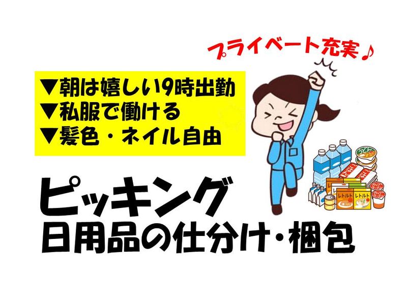 仕事内容 \ドラッグストア商品の仕分け・ピッキング/ 「安定した職場で働きたい」 「日勤だけの仕事がしたい」 「人と関わるより、1人作業の方が向いている」 そんな方にピッタリの職場です! ー 【お仕事内容】 商品の仕分け、ピッキングをお願いいたします。 作業内容はシンプルで、未経験の方でも安心してスタート可能です! <作業の流れ(例)> ① レーンに流れてきた商品の仕分け ② 店舗ごとに箱詰め 飲料水やマスク、洗剤などの日用品がメインです。 ★作業はマニュアル通り! ★未経験から始められます ★服装自由! ★朝は嬉しい9時スタート ★時短勤務でも可能 ー 【未経験スタート9割以上】 「工の名前すら知らなかった」 そんな方も活躍している職場です◎ ✅ 教育担当の先輩がマンツーマンで指導 ✅ 覚えるまでは簡単な作業からスタート ✅ 作業は分業制なので「いきなり任される」ことはナシ! ー 【働きやすさポイント】 ✔ 日勤のみ!生活リズムが安定 ✔ 日曜+平日1日休みのシフト制 ✔ 残業なしで予定が立てやすい ✔ モクモク作業中心!人間関係のストレス少なめ ✔ ネイル・髪色自由 ー 【こんな方におすすめ】 ・未経験から工場の仕事に挑戦したい方 ・シンプルな工場作業で安定収入を得たい方 ・プライベートも大切にしたい日勤派の方 ・地元で長く働きたい方 ・即日スタートしたい方