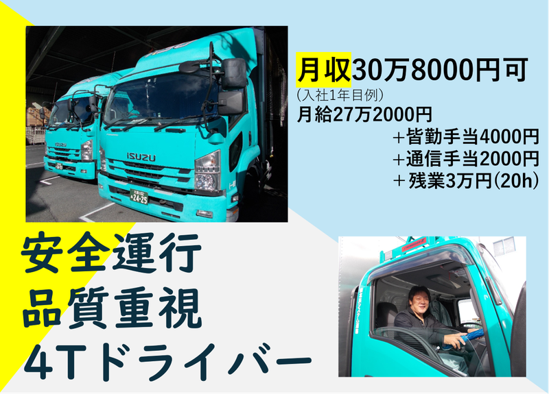 仕事内容 「仕事の特徴」 ●店舗家具や什器を中心に印刷機や折り込み機などを輸配送。 ●ルート配送とは違い、時間に追われません。 ●近畿エリアがメイン、時々中距離もあり。 ●中長距離はしっかり手当が付くので、稼ぎたい人に人気! ●希望者が多い時は順番に担当してもらっています。 「アピール情報」 ●丁寧な梱包や養生が評判です。どんな時も品質重視かつ安全運転が第一。 ●未経験出身者多数活躍中! ●もちろん経験者は大歓迎ですが、丁寧に教えますので未経験からはじめて活躍する方も多いです。 ●準中型免許をお持ちの方は、中型取得支援制度があるのでご応募ください! 4tトラックデビューなどチャレンジしたい方もぜひ! ======================== お電話でのご応募も歓迎です。 電話番号:0667462201 受付時間:平日/8:40~17:40、土曜/8:40~12:00 担当の鶴下まで、お気軽に。 ========================