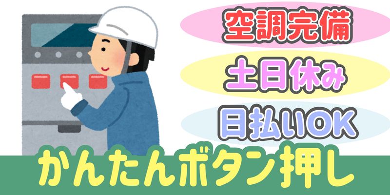 仕事内容 原料を機械に投入し、機械のボタンを押すだけの簡単操作がメインのオシゴト 混ぜる前の原料を小分けにする作業などもお願いします 空調完備でカイテキ!かんたんな作業なので未経験でもすぐ活躍できます 20歳~40代後半の男性在籍中! ・就業場所は藤の台工業団地内 オススメpoint ・土日休み ・仕出し弁当(1食380円)あり もちろんお弁当持参も◎ ・休憩室や更衣室あり ・空調完備でカイテキ ・就業時間の相談可 ・作業着は会社で洗濯してもらえます ・ロッカーあり ・未経験者 OK! ・土日休みが良い方 ・日勤のお仕事お探しの方 ・長期で働きたい方 ・かんたん作業をご希望の方 ・1月あたりの平均残業時間20h 【こんな経験活かせます!】 パート、アルバイト、契約社員 雇用形態問わず、下記の経験ある方は活かせます! ・機械オペーレター ・マシンオペレーター ・ボタン押し ・仕分け ・機械操作 ※もちろん必須ではありません! まずはお気軽にご応募ください! ///////////////////////////////////////// (WEBでご応募の場合) お電話番号を記入していただくと ご案内がスムーズです。 /////////////////////////////////////////