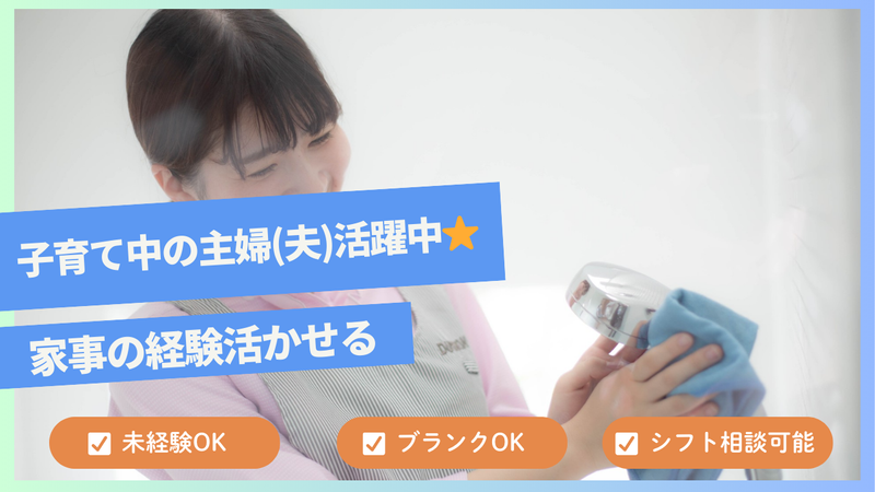 求めている人材 【求める人材】 ・家事、お掃除が好きな方 ・育休明けの主婦・主夫の方も活躍中! ・明るく笑顔で挨拶できる方 ・ミドル、シニア幅広く活躍中 ・ブランクあり、フリーターの方もOK <こんな方におすすめ> ・コツコツ/モクモク作業が好き ・お客様との会話/接客を楽しめる ・ホテル清掃/客室清掃の経験がある ・施設清掃/学校清掃/オフィスビル清掃の経験がある ・洗車/洗浄/クリーニング作業の経験がある