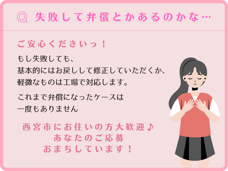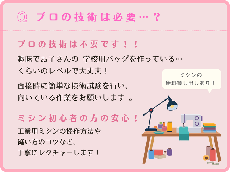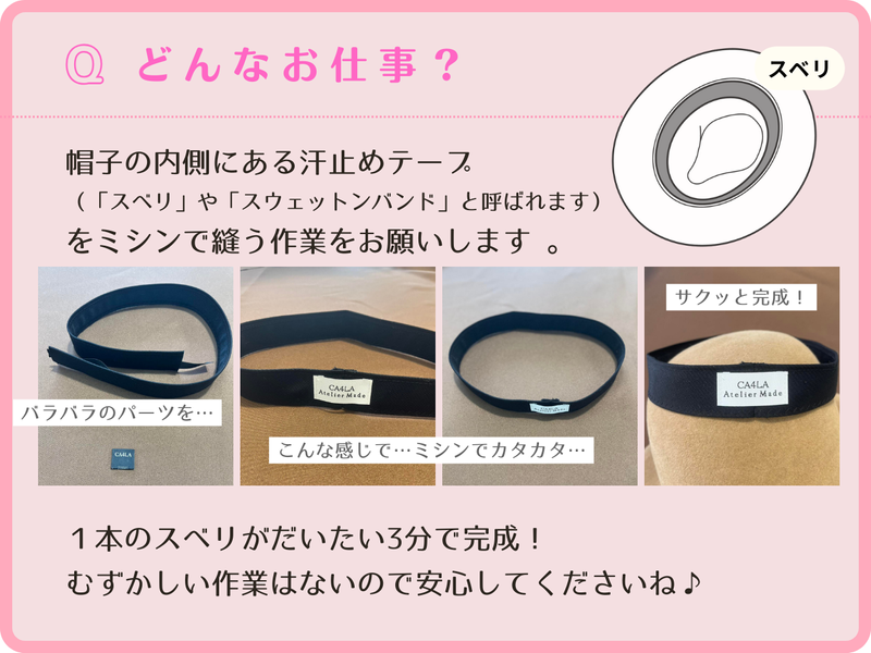 仕事内容 ╭━━━━━━━━━━━━━━╮ お気に入りのミシンで、 憧れの帽子づくりをお手伝い♪ ╰━━━━v━━━━━━━━━╯ 「趣味の裁縫を活かして、家計の足しにしたい」 「子供が小さいから、外に働きに出るのは難しい…」 「納期さえ守れば、夜でも昼でも好きな時に働きたい!」 ──そんな方にぴったりな、 完全在宅の内職ワークです◎ \30代のママさん・主婦さんが中心に活躍中!/ 未経験スタートでも、 普段からお子様のバッグなどを 縫っている方なら即戦力✨ コツコツ作業が好きな方、 CA4LAの帽子が好きな方、大歓迎です。 ■ここがオススメ! ┈┈┈┈┈┈┈┈┈•• ✅ 完全在宅!スキマ時間を有効活用✨ お仕事はすべてご自宅で完結。 家事や育児の合間に、自分のペースで進められます 。 ✅ ミシンの無償貸し出しあり♪ 「ミシンに興味があるけど持っていない」 という方も安心。 無償でのレンタルも可能です。 もちろん、 ご自身の家庭用ミシンでも縫えればOKです ! ✅ 資材の配送サポートあり ご自宅への配送も相談可能! 積み下ろしももちろんお手伝いします 。 ✅ ノルマなし!納期相談も柔軟に◎ 「1日◯個」といった厳しいノルマはありません。 お子様の急な発熱などで 納期が厳しくなりそうな時も、 早めに相談すれば調整OKです 。 ✅ 消耗品はすべて支給! 糸、針、ボビンなどの消耗品は セットでお渡しします。 自己負担なしで始められるのが嬉しいポイントです 。 ■どんなお仕事? ┈┈┈┈┈┈┈┈•• 帽子の内側にある汗止めテープ (「スベリ」や「スウェットンバンド」と呼ばれます) をミシンで縫う作業をお願いします 。 〈お仕事の流れはこんな感じ✨〉 ① 条件のご相談と確認 こちらから 「作業内容・個数・納期」などをご連絡します。 双方で確認ができたら、 お仕事スタートです! ② 来社・資材の受け渡し 西宮アトリエにお越しいただき、 作業説明と資材の受け渡しを行います。 (所要時間は5分〜10分程度です!) ミシン初心者の方も安心! :工業用ミシンの操作方法や 縫い方のコツなど、 丁寧にレクチャーします (1時間程度〜。個人差があっても大丈夫です!) ③ 作業開始・納品 ご自宅でコツコツ作業! 週に1回程度の頻度で 納品・受取をお願いします 。 ※納品の配送方法 (ご自宅への配送・回収)も相談可能です ⭐ステップアップも! 技術が上がれば単価もアップ! ゆくゆくは扶養内のパートスタッフとして 登用された実績もあります 。 ■こんなご不安&ネックを解消っ! ┈┈┈┈┈┈┈┈┈┈┈┈┈┈┈┈•• Q:プロの技術が必要? A:プロの技術は不要です! 趣味でお子さんの 学校用バッグを作っているくらいのレベルで大丈夫! 面接時に簡単な技術試験を行い、 向いている作業をお願いします 。 Q:失敗して弁償になったらどうしよう… A:ご安心くださいっ! もし失敗しても、 基本的にはお戻しして修正していただくか、 軽微なものは工場で対応します。 これまで弁償になったケースは一度もありません◎ Q:家が散らからない? A:そこまで気にならないと思います◎ ミシン作業の資材(スベリ)は 段ボール1箱分程度とコンパクト! 糸くずが少し出る程度なので、 お部屋を占領することはありません。
