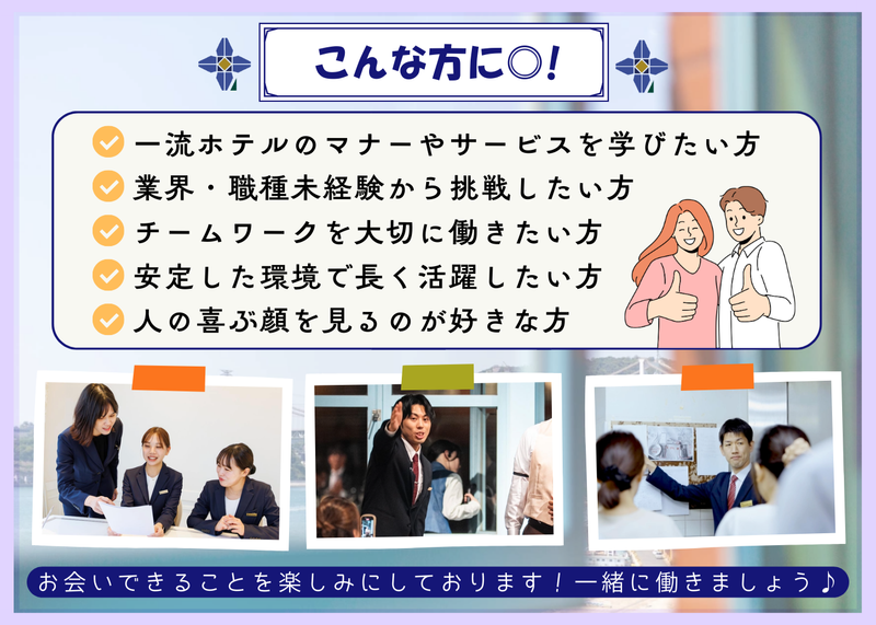 求めている人材 \\初めてのアルバイト・パートも大歓迎!// 未経験者歓迎!ブランクのある方もOK! しっかりフォローしますので、安心してスタートできます! もちろん経験者の方も大歓迎です! ≪優遇条件≫ ◎ブライダルやサービスの勉強をされている方 ◎飲食業界での勤務経験がある方 ◎接客経験をお持ちの方 ≪こんな方にピッタリ!≫ ◎業界・職種未経験から挑戦したい方 ◎チームワークを大切に働きたい方 ◎一流ホテルのマナーやサービスを学びたい方 ◎安定した環境で長く活躍したい方 ◎地元・門司港を盛り上げたい方 ◎人の喜ぶ顔を見るのが好きな方 ⏰ご応募お待ちしております⏰ ホテル業界に興味がある方、これから挑戦したい方もお気軽にご応募ください✨ お会いできることを楽しみにしています!
