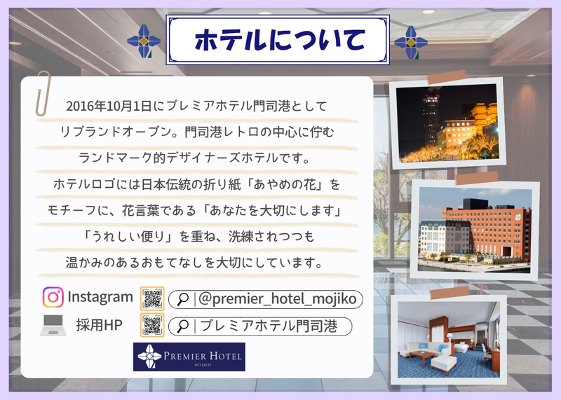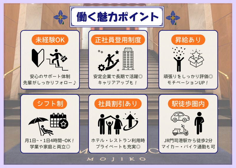 仕事内容 \未経験◎結婚式やパーティーを支えるお仕事/ ✨【ホテルのサービススタッフ募集】✨ 「結婚式という特別な一日を支えたい」 「ホテルで本格的なサービスを学びたい」 「未経験からホテル業界で挑戦してみたい」 そんなあなたにピッタリのお仕事です! ✨未経験・ブランク歓迎!丁寧なサポート体制で安心スタート◎ ✨月1日~、1日4時間~OK!スキマ時間で無理なく働ける◎ ✨学生&主婦(夫)活躍中!扶養枠内OK!Wワークも可能◎ ✨正社員登用あり!キャリアアップも目指せます◎ ✨昇給あり!頑張りをしっかり評価◎ ✨社員割引あり!ホテル・レストラン利用でプライベートも充実◎ ✨通勤ラクラク♪最寄駅徒歩2分&マイカー・バイク通勤もOK◎ ✅会社情報発信中!ぜひチェックしてください♪ =============== ⏬Instagram 【@premier_hotel_mojiko】 ⏬採用HP 【https://mojiko-recruit.kenhotels.com/】 =============== ✅どんな会社? 2016年10月1日にプレミアホテル門司港としてリブランドオープン。 門司港レトロの中心に佇むランドマーク的デザイナーズホテルです。 ホテルロゴには日本伝統の折り紙「あやめの花」をモチーフに、花言葉である「あなたを大切にします」、「うれしい便り」を重ね、洗練されつつも温かみのあるおもてなしを大切にしています。 ✅仕事内容 結婚式や宴会で、お客様の特別な時間をサポートするやりがいのあるお仕事。 会場設営や料理・ドリンクの提供、進行のサポートなど、チームで協力しながら進めます。 ≪具体的に…≫ ■結婚披露宴、企業宴会、パーティーの運営 ■お客様のご案内 ■料理・ドリンクの提供 ■会場設営、撤収 ■進行サポート など サービススキルやマナーは、働きながら自然と身につきます!チームで一体感を持って運営できるので安心です♪ ⏰入社後について 入社後は3ヶ月間のOJT研修からスタート! まずは簡単な作業から段階的に少しずつお任せします! 経験豊富なスタッフがサポートするため、すぐに活躍可能です♪ ✅アルバイト社員インタビュー ≪入社3年目/主婦Aさん≫ Q:入社したきっかけは? A:子育ての合間に無理なく働ける仕事を探していました。 ホテルでのサービスは未経験でしたが、「結婚式やパーティーでお客様を笑顔にできる仕事」という点に惹かれて応募しました。 面接のときに「未経験でも大丈夫」と言ってもらえて安心しました。 Q:現在の仕事内容は? A:結婚披露宴や企業宴会で、料理やドリンクの提供を担当しています。 会場設営や進行サポートも行い、最近では新人アルバイトの簡単なフォローも任されるようになりました。 少しずつできることが増えていくのが楽しいですし、家庭との両立もしやすいシフトで働けています! Q:未経験スタートでも大丈夫ですか? A:全く問題ありません!最初は立ち居振る舞いやマナーがわからなくても、 先輩が丁寧に教えてくれますし、チームで動くので一人で困ることはありません。 実際、ほとんどのスタッフが未経験スタートです♪ Q:仕事のやりがいは? A:披露宴の最後、新郎新婦やご家族が笑顔で退場される瞬間が本当に嬉しいです! 「ありがとう」と言っていただけると、疲れも一気に吹き飛びます! 誰かの大切な一日を支えている実感が、この仕事の最大の魅力です。 Q:職場の雰囲気は? A:チームワークが良く、お互いに助け合える環境です。 忙しいときも声を掛け合えるので、年齢や経験に関係なく相談しやすい雰囲気があります。 家庭との両立でブランクがあっても、すぐに馴染めました! Q:求職者へ一言! A:未経験でも大丈夫!生活スタイルに合わせてシフトを組めるので、無理なく働けます! 最初の一歩は勇気がいりますが、挑戦してよかったと思っています。 「やってみたい」という気持ちがあればOK!一緒に誰かの特別な一日を支える仕事をしてみませんか?✨