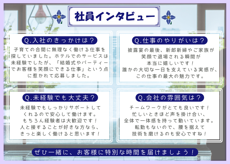 選考プロセス 【募集背景】 サービス向上を目的として、バンケット部門の体制強化を行うため新たにスタッフを募集いたします。 より多くのお客様に心地よい時間をお届けするため、チームの一員として一緒に働いてくれる方を歓迎します。 未経験の方も大歓迎!ぜひチャレンジしてみませんか?ご応募お待ちしています! 【選考フロー】 応募→書類選考→面接→内定 ※ご不明な点は、お電話やホームページよりお気軽にお問い合わせください。