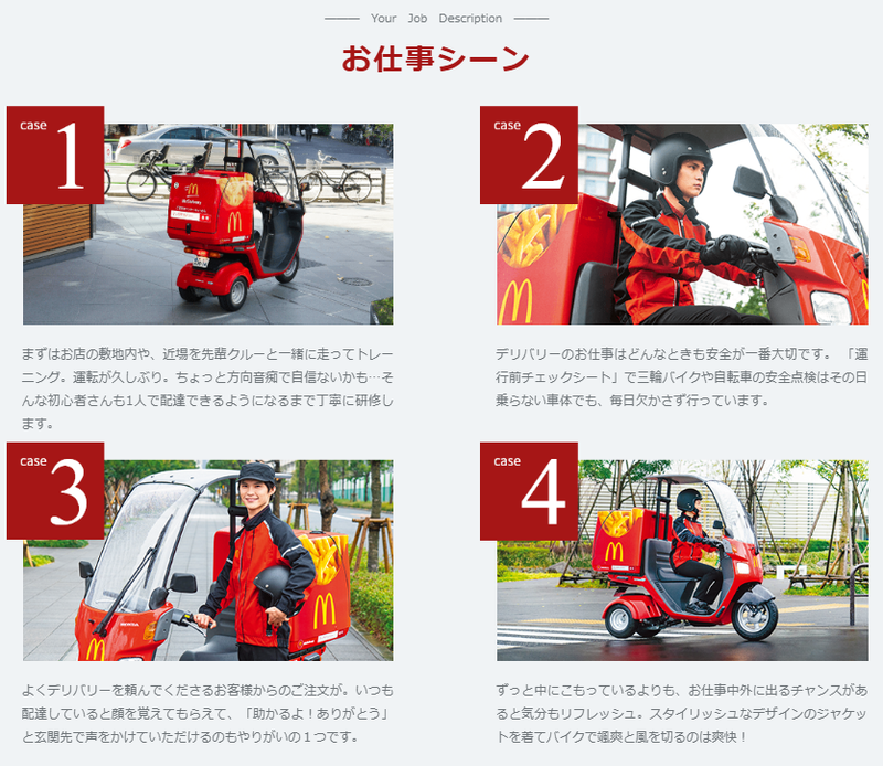 仕事内容 マクドナルドのデリバリークルー募集! 専用バイクや自転車で、お客様のもとへ商品をお届けするお仕事です。 免許の種類に応じて配達方法は相談OK! ■ 具体的なお仕事の流れ 【1】WEBで注文が入ります 【2】店内スタッフから商品を受け取り、専用バッグへセット 【3】安全運転でお客様のもとへ出発! 【4】商品をお渡し&お会計 【5】「ありがとうございました!」と笑顔でごあいさつ 【6】お店へ戻ります シンプルな流れなので、すぐに覚えられます♪ ■ 未経験でも安心! ・バイクの乗り方 ・安全運転のコツ ・接客マナー すべて丁寧にトレーニングします。 デリバリー未経験でも大歓迎! ■ この仕事の魅力 ・外に出てリフレッシュしながら働ける ・一人の時間もあり、気楽に働ける ・安全第一で無理な配達はありません ・配達がない時間は店内サポートで安定して働ける ※配達がない時間帯は、調理やカウンター以外の店内業務をお願いすることがあります。