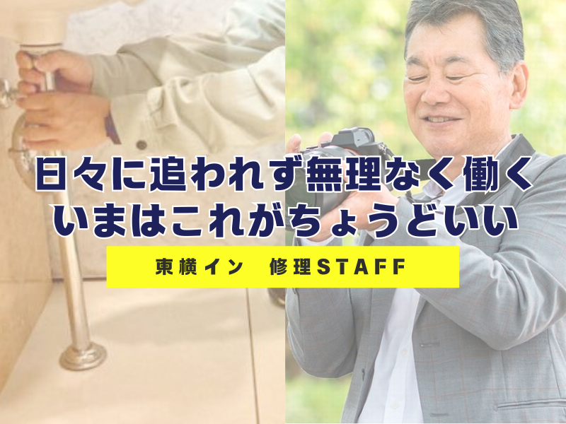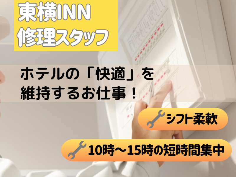 仕事内容 東横INNの 館内・客室の修繕やメンテナンス をお任せ! ✅ 壁紙の補修や照明交換 ✅ 空調・カードキー・テレビの簡単な調整 ✅ 客室や館内の設備チェック&メンテナンス 清掃チームと連携し、ホテル全体を快適に! 難しい修理は専門業者が対応するので安心♪ 「資格を活かしてもうひと頑張り!」 「無理のないペースで働きたい!」 そんな方にピッタリのお仕事です! *時間を有意義に使える働き方  ̄ ̄ ̄ ̄Ⅴ ̄ ̄ ̄ ̄ ̄ ̄ ̄ ̄ ̄ ̄ ̄ ̄ ̄ 今回は10時~15時の5時間勤務の募集! 資格を活かして、時間を有効活用しませんか? *手先が器用な方大歓迎!  ̄ ̄ ̄ ̄Ⅴ ̄ ̄ ̄ ̄ ̄ ̄ ̄ ̄ ̄ ̄ ̄ ̄ ̄ 日曜大工やDIYなど、手先を使った作業が 得意な方はすぐに活躍できます! \応募方法/  ̄ ̄ ̄ ̄ ̄ ̄ ✨直接採用担当とお話ししたい方 →電話での応募大歓迎! 084-916-1045 までお気軽にお問い合わせください! ✨【応募】ボタンから応募の方 →エントリー後、担当者からご連絡差し上げます。