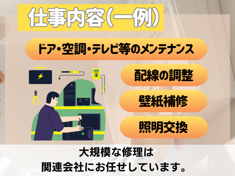 求めている人材 要電気工事士資格 年齢不問 <以下のいずれかに当てはまる方尚歓迎> ・壁紙など内装のリペア経験がある方 ・水回り設備の修理経験がある方 ・手先の器用さには自信がある ・日曜大工やDIYが得意 ・ボイラー技士資格者