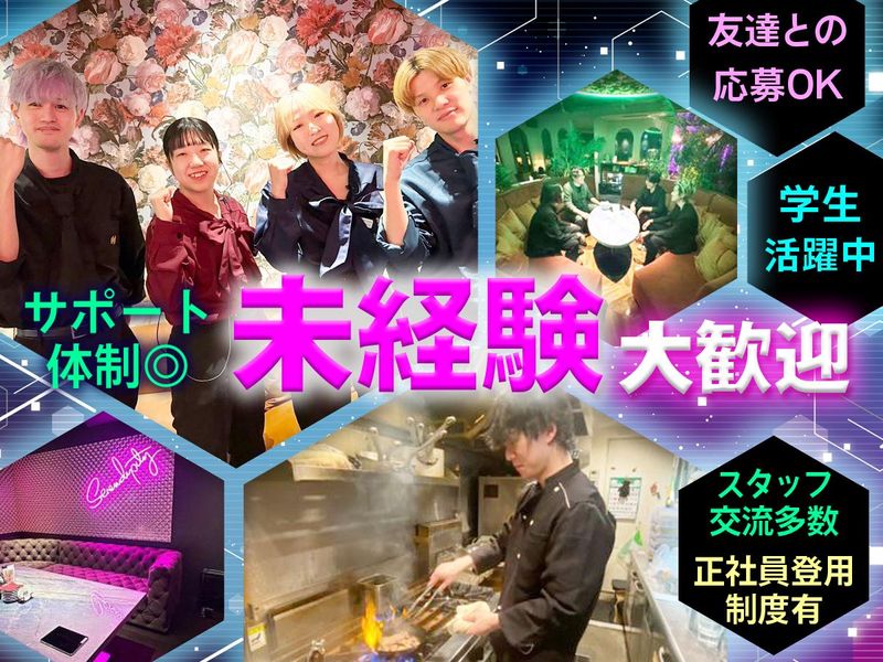 求めている人材 \\ 未経験OK! // 資格・経験・性別は一切不問! バイトデビューも大歓迎!! ◆20歳以上の学生・フリーター・Wワーカー活躍中! ◆正社員を目指しているという方大歓迎! ◆終電を過ぎる可能性もあるので、近隣の方必見! ※高校生のご応募はご遠慮ください。 \\ こんな方にオススメ! // □接客が好き、話すことが好きな方 □英語が話せる方 □やりがいを持って働きたい方 □ゆくゆくは正社員として働きたい方 □しっかり稼ぎたい方 □スタッフ仲が良い環境で働きたい方 ―――――――――――――――――― \\ 未経験でも安心! // 適性を考慮し、あなたにピッタリの仕事をお任せします◎ 業務内容はしっかりレクチャー! まずは出来ることから、少しずつ覚えていきましょう! サポート&フォロー体制も充実していますので、未経験の方でも安心して業務をスタートすることができます。 誰だって最初は未経験。分からないことがあれば、先輩スタッフがしっかりフォローします。 安心して始められる環境を整えてお待ちしています☆彡 \\ スタッフ仲◎ // 定期的な社内外のレクリエーションも豊富で、みんなが和気あいあいと楽しく業務に励んでいます!