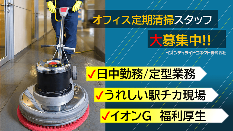 企業PR イオングループで安定した経営を続けていた“設備メンテナンス”と“清掃”で 事業を拡げていた2社が2021年春に合併してできた当社。 強みとしてきたエリア・事業を相互補完し、全国に展開するチェーン店舗や 商業施設に対して、施設管理の窓口として複合サービス(設計、建設施工、設備管理、清掃)を 提供しています。 今まで当たり前に利用していた街にあるお洒落なカフェ、 大手スーパーマーケット、便利なショッピングモール。 人々の生活に必要不可欠な店舗の経営に関わることができ、 街づくりや地域活性の一端を担うことができます。 イオンディライトコネクトで、あなたも日本の地域活性に貢献する 「街づくり」の仲間として共に成長しませんか?