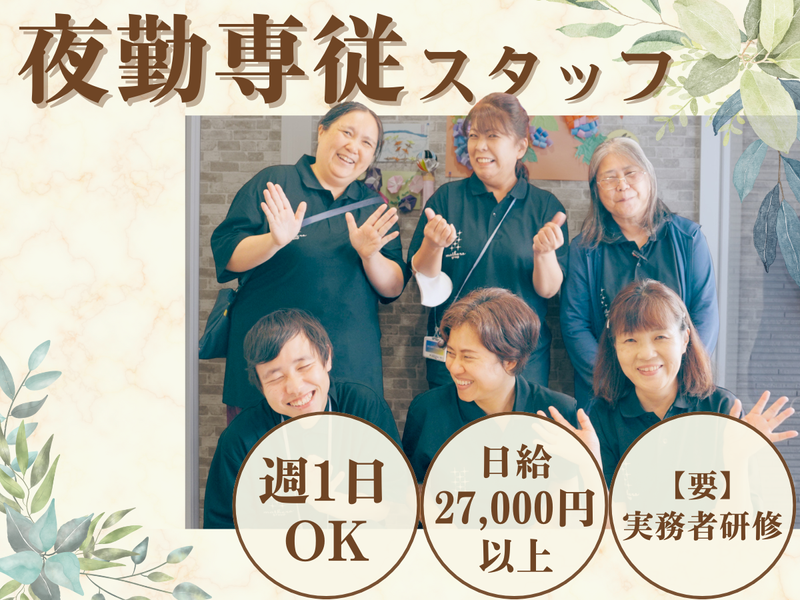 仕事内容 ✅日給27,000円+交通費支給 ✅初任者研修あればブランクOK ✅入浴介助なし/身体にやさしい夜勤 \オープニングスタッフ/ ================== ✨2026年3月 ✨ ✨名古屋市西区に新施設OPEN予定✨ ================== 新しい施設だからこそ、 みんな同じ“はじめまして”からのスタート! 24時間看護師が常駐する安心の体制で、 医療面のサポートも万全です。 マイカー通勤OKで通いやすさも◎ オープン前に近隣施設での事前研修もあり、 初めての方も安心して始められます。 ▼仕事内容の概要 新設の住宅型有料老人ホームで、 夜間帯の介護業務全般をお願いします。 入浴介助はなく、 見守りや食事介助などがメインです。 ▼<具体的には…> ・施設内訪問による夜間ケア (移乗、排泄、食事介助など) ・調理補助(湯煎・解凍・盛り付けなど) ・配膳・下膳 ・簡単な清掃 ▼1日の流れ(夜勤) 16:00 出勤・申し送り 18:00〜 食事対応・巡回 22:00〜 巡回・記録・休憩 6:00〜 朝食準備・配膳 10:00 退勤 【スタッフの声】 夜勤の仕事は久しぶりで不安でしたが、 先輩スタッフがやさしく 教えてくれてホッとしました。 夜は落ち着いて仕事ができ、 無理なく続けられています。 1日だけの勤務でも、 しっかり稼げるのが嬉しいです。 昼間は家事や自分の時間も取れるので、 生活のバランスが取りやすいですね。 <⭐夜勤1回でしっかり稼げる> 日給27,000円は夜勤手当込みの金額。 週2回の勤務でも月収21万円超! 扶養内で働きたい方、 副業で収入を増やしたい方にも ぴったりの働き方です。 <⭐負担少なめ&無理なく働ける内容> 入浴介助なし。夜間の見守り・ 巡回・食事対応が中心。 体力に不安がある方や、 長時間の介助が心配な方でも 続けやすい環境です。 <⭐週1日〜シフト相談OK!> 家庭や副業の都合に合わせて、週1日〜OK! 「土日だけ」「平日メイン」 などの相談もOK。 希望のペースで長く働ける夜勤シフトです。