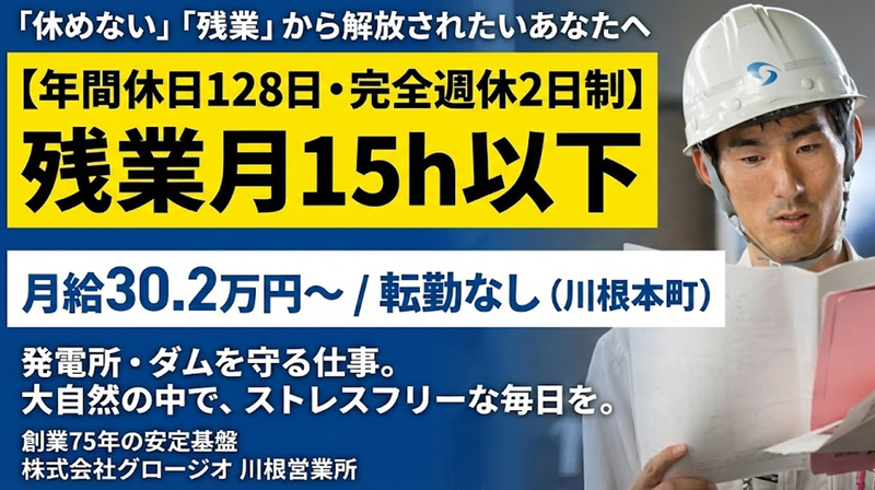 仕事内容 ◤ ̄ ̄ ̄ ̄ ̄ ̄ ̄ ̄ ̄ ̄ ̄ ̄ ̄ ̄ ̄ ̄ 年休128日・残業月15時間を実現。 「ストレスがない毎日へ」 SLの汽笛が響くのどかな町で、 建築施工管理技士として活躍しよう。 __________________◢ 「休めない、残業が多い」という 業界の思い込みは、もう捨てましょう。 創業77年の歴史を持つ「グロージオ」は、 「新4K(給料・休暇・希望・きれい)」 改革を通じ、社員のワークライフバランスを 徹底追及。 「土日休み」「年休128日」「残業月15時間」を当たり前にしています。 長時間労働、人間関係などのストレスもなく、仕事だけでなくプライベートも充実できる場所であなたの技術を活かしませんか? \\✨アピールポイント ✨// ━━━━━━━━━━━━━━━━━━ ✅社会インフラに欠かせない発電所などの 修繕工事などを中心に地域密着を目指し、 他社にはまねのできないサービスを提供 するオンリーワンの仕事です。 ✅「手元に残る豊かさ」を最大化する待遇 月給30万〜47万円に加え、 住宅・家族手当を完備。 ━━━━━━━━━━━━━━━━━━ <<仕事内容>>  ̄ ̄ ̄ ̄ ̄ ̄ ̄ ̄ ̄ ̄ ̄ ̄ ̄ ̄ ̄ ̄ ̄ ̄ ̄ 修繕工事を中心とした、 建築施工管理のマネジメント全般を お任せします。 <<具体的な仕事内容>>  ̄ ̄ ̄ ̄ ̄ ̄ ̄ ̄ ̄ ̄ ̄ ̄ ̄ ̄ ̄ ̄ ̄ ̄ ̄ 発電所、ダムなど、人々の暮らしを守る 多様なインフラ現場中心に監督します。 ⏩品質・コスト・工程・安全・環境の管理 ⏩現場の進行管理・協力会社への指示出し など ╭━━━━━━━━━━╮ ✔当社について ╰━v━━━━━━━━╯ 【企業理念】 『大地を育み 未来へ紡ぐ』 人々の生活を守る「安全」と、 持続可能な「環境」を創造すること。 それが、私たちに課せられた使命です。 【私たちについて】 静岡県中部地区を拠点に活動する当社は、 2024年4月に創業75周年を迎えた 総合建設会社です。 長い歴史に裏打ちされた安定基盤を 持ちながらも、山間部から沿岸部まで、 案件の規模を問わずあらゆるフィールドの 工事に挑戦し続けています。 【事業内容】 ■土木工事事業 公共事業を中心に、規模の大小を問わず 多彩なインフラ整備を展開しています。 <主な施工実績> └大井川牛尾築堤護岸工事 └榛原川大札北沢治山工事 └大井川東河内治山工事 └東名高速道路「大井川焼津スマートIC」 など ■建築工事事業 公共施設から商業施設まで、 企画・設計・施工を一貫して 手がけています。 <主な施工実績> └エスポット清水天王店 └太陽建機レンタル島田支店 └静岡県環境衛生科学研究所 など ■不動産開発事業 価値ある土地の仕入れ、 ポテンシャルを引き出す用地企画、 そして豊かな暮らしを届ける 宅地分譲販売を行っています。 【働き方改革:社員の幸せを追求】 歴史ある会社だからこそ、 時代に合わせた「新しい働き方」を。 弊社では、 新4K(給料・休暇・希望・きれい) の実現を掲げ、社員一人ひとりの幸福を 追求しています。 働き方改革に真摯に取り組み、 仕事もプライベートも充実できる 環境づくりに注力しています。 【当社HP】 ▶https://www.growgeo.co.jp/  ̄ ̄ ̄ ̄ ̄ ̄ ̄ ̄ ̄ ̄ ̄ ̄ ̄ ̄ ̄ ̄