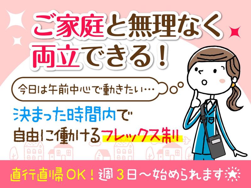 職場環境 移動はすべて使い慣れた自家用車でOK。重い荷物を持って歩く必要はありません。 好きな音楽やラジオを聴きながら、冷暖房のきいた車内でリラックスして移動できます。 テキパキ進めて担当分を終えれば、そのまま直帰できるのも嬉しいポイント! 喫煙所:喫煙所あり(屋外)