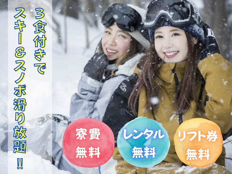 シフト制 勤務時間・曜日: 2025年12月20日~2026年3月31日の間の15日~3ヶ月勤務の短期バイト ・食事3食付き(1日500円) ・個室寮完備 ・レンタル品無料(ボード・スキー・ブーツ・ウェア) ・平日はリフト券無料!