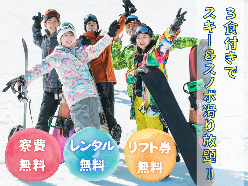 勤務時間・曜日: 2025年12月20日~2026年3月31日の間の15日~3ヶ月勤務の短期バイト ・食事3食付き(1日500円) ・個室寮完備 ・レンタル品無料(ボード・スキー・ブーツ・ウェア) ・平日はリフト券無料!