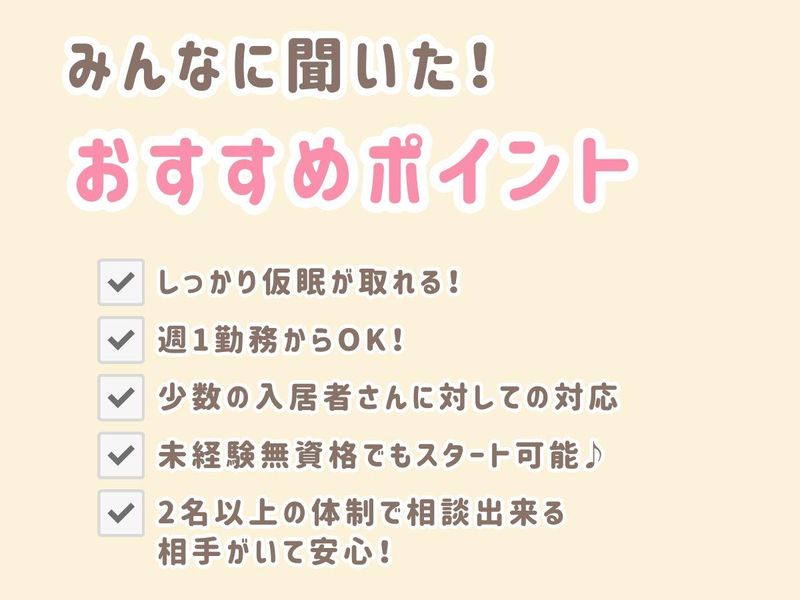 仕事内容 <ポイント> □夜勤は2名体制&最大4名の少人数対応 □仮眠時間ありで体への負担少なめ □夜勤明けはしっかり休み → 自分の時間も大切にできる □無資格・未経験OK/異業種からの転職者多数 □賞与年3回(実績3~5ヶ月分)で安定収入 <仕事内容> 障がいをお持ちの方が暮らすグループホームでの 夜間中心の見守り・生活サポートです。 ●見守り・声かけ ●食事準備(温め中心) ●トイレ・入浴のサポート ●記録作成(簡単な入力) ※利用者様最大4名 ※職員2名体制のため、一人で抱え込むことはありません