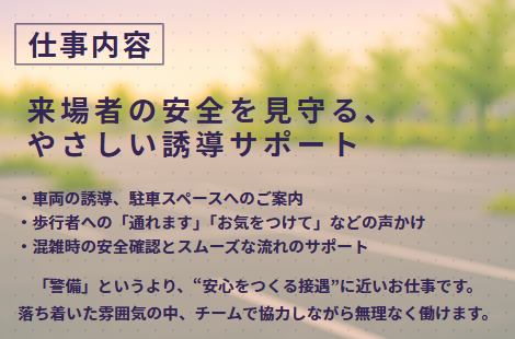 仕事内容 朝の5時間だけ働いて、午後はまるごと“自分の時間”。 家事・育児・学業・副業と両立しやすい、無理のない働き方です。 守谷SA下りでの駐車場誘導サポートは、 「朝のうちに少し働きたい」「午後は家事や趣味に使いたい」 そんな方にぴったり。 土日祝だけの勤務なので、 家庭や本業との両立もしやすく、 未経験の方でも安心して始められる環境です。 【おすすめポイント】 ✅ 土日祝・大型連休限定(事前申請制で予定調整OK) ✅ 実働5時間で日給10,600円(時給換算2,100円) ✅ 入社祝い金 最大10万円支給 ✅ Wワーク・学生・主婦(夫)歓迎 ✅ 交通費全額支給・送迎手当あり・車通勤OK ✅ チーム制&研修ありで未経験も安心 ✅ 月数回だけの勤務もOK ✅ 「週末だけ」も「週5で安定収入」もOK(平日他現場も多数あり) 【仕事内容】 高速道路サービスエリア内の駐車場で、 来場者の安全とスムーズな通行をサポートする交通誘導のお仕事です。 <具体的な業務> ・車両の誘導、駐車スペースへのご案内 ・歩行者への「通れます」「お気をつけて」などの声かけ対応 ・混雑時の安全確認とスムーズな流れのサポート 「警備」というより、“安心をつくる接遇”の感覚に近いお仕事です。 落ち着いた雰囲気の中、チームで協力しながら無理なく働けます。 【勤務スタイル】 ・勤務時間:6:00〜12:00(休憩1時間/実働5時間) ・出勤日:土日祝・大型連休中心 ・勤務は事前申請制で調整可能 → 午後は自由時間!授業・家事・趣味との両立に最適 【スタッフの声】 ▶ 学生/20代男性 授業が午後からの日は、朝だけサッと働けるこの仕事がちょうどいいんです。 最初は緊張しましたが、先輩が丁寧に教えてくれて安心しました。 「ありがとう」の声をかけてもらえると、ちょっと誇らしい気持ちになりますね。 ▶ 主婦/30代女性 家族が起きる前にサクッと勤務。お昼には帰れるので、家事や育児にもしっかり時間が使えます。 短時間でもしっかり稼げて、気分転換にもなるのがうれしいです。