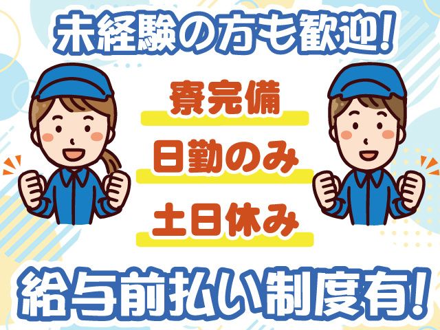 仕事内容 柏市金山にある工場での住宅部品の組立や製造のお仕事! 働きやすさバツグンの日勤固定&土日休み! CMでも有名な大手企業様です! 【おすすめポイント】 〇工場や製造業が未経験の方もOK! 〇日勤固定 〇土日休み(週休2日制) 〇車・バイク・自転車通勤可 〇備品ありの1R寮完備 〇給与前払い制度あり 【組立・製造スタッフの仕事内容】 物置などの大型の製品からオフィス用の家具まで 幅広く扱う大手企業の工場での製造業務です。 配属により組立またはマシン操作の業務をおまかせします。 <住宅部品の組立> ライン作業での組立となります。 物置やガレージを組み立てる部品のため、扱う部品はさまざまです。 大きい部品がある場合は2人1組で作業しますので、 重量物を1人で扱うことはありません。 <マシンオペレーター業務> 溶接を行う機械を操作します。 機械に部品をセットしたらボタンを押せばOK! 溶接は機械が自動で行うので、特別な経験は必要ありません! 機械の操作はしっかりお教えします。 カンタンな作業なので未経験の方もご安心下さい! 工場や製造業が未経験の方も大歓迎。 ブランクがある方もOK。 もちろん、製造業や工場での経験がある方も歓迎。 20代・30代・40代の方が活躍中です! 8:00~17:00の日勤固定での勤務です。 働きやすい時間帯に加え、土日休みの週休2日制! プライベートの時間も大切にしたい方にピッタリ。 夏季や年末年始休暇もあるので帰省や旅行も可能です! 【遠方からご応募の方も安心!寮完備!】 入寮希望の方には、寮も完備しています! 引越しのお手伝いもOKですので、 遠方からのご応募の方もご相談ください。 備品が揃っているのでかばん1つですぐにお仕事開始も可能です。 一人暮らしを始めてみたい方も当社がバックアップします! 【給与前払い制度あり】 急な出費やお財布がピンチの時も嬉しい! 前払い制度が利用できます。 お仕事を始めたばかりで収入が少ない時も安心。 お気軽にご相談ください。 【当社について】 株式会社日輪では、 ・社会保険完備 ・給与前払い制度 ・制服貸与 ・交通費支給 ・健康診断 など、基本的な福利厚生を整備しております また各拠点に自社所有の社員寮を完備しています。 職場に近い住居を常時確保することで、 快適な新生活をスタートするとともに、 遠方からの就業のサポートも行っております。 生活の安定を目指して長期雇用のお仕事をお探しの方、 ぜひ当社へ一度ご相談ください ご質問やご相談などありましたら、お気軽にお問い合わせください。 職場見学も実施しております! 入社日についてもご相談ください。 株式会社日輪 関東支社 0120-077-701(平日9:00~16:00) 当社の採用サイトはこちらです https://entori.jp/nichirinn-kanto 最新情報を随時更新中です