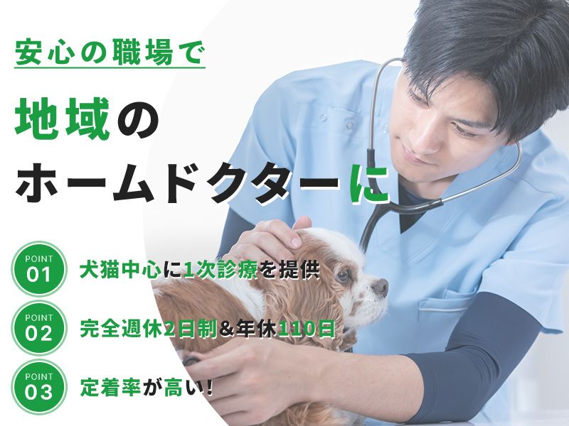 アピールポイント \ こんな環境です / 獣医師2名・看護師3名が在籍。 少数チームで、新入社員さんを 丁寧にフォローします! ✨年俸420~600万円 月給30万円~40万円を想定。 勤勉手当(月8割の出勤)+2万円 日々の取り組みを適正に評価します。 ✨完全週休2日×残業少なめ 年間休日110日+長期休暇あり。 プライベートも充実できる環境です! ✨獣医師の定着率100%(10年間) 和やかな雰囲気で、チームワーク抜群 実務未経験の方もご安心ください!