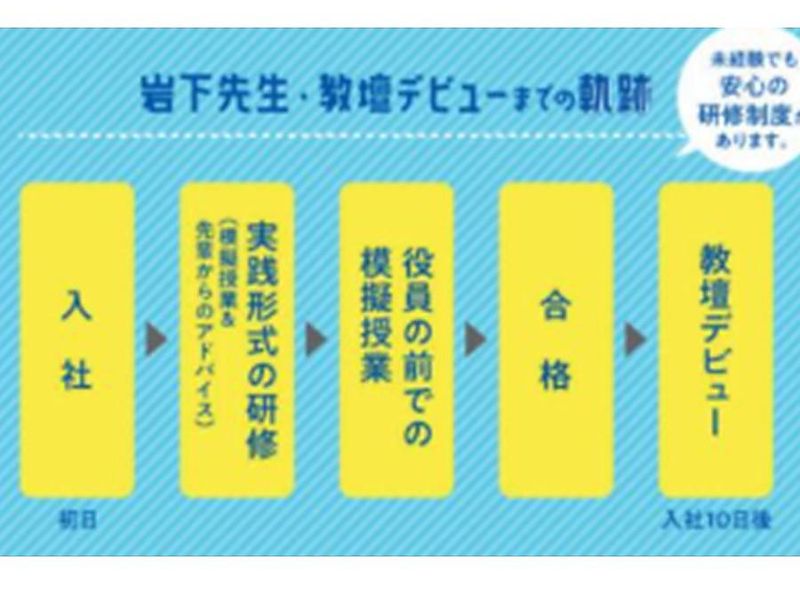 選考プロセス ■現在勤務中の方も、できるだけ 支障のないように致します。 面接日・入社日は相談に応じます。 ■お送りいただいた個人情報は、 当社で厳重に管理し採用選考の目的に のみ使用させて頂きます。 【選考フロー】 書類選考後、面接日等をご連絡します ↓ 1次面接・筆記試験(得意科目を見るためのものです) ↓ 2次面接 ↓ 授業見学または人事担当者との面談 ↓ 最終面接 ↓ 内定